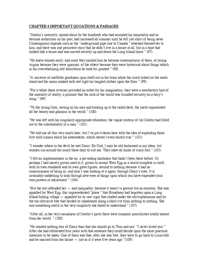 Great gatsby quotes chapter 6. Gatsby indicated a gorgeous, scarcely human orchid of a woman who sat in state under a white plum tree. Everything gatsby is driven for is because of cody when he gave him that job. The great gatsby by f. Although he believed that his idealized future was.
